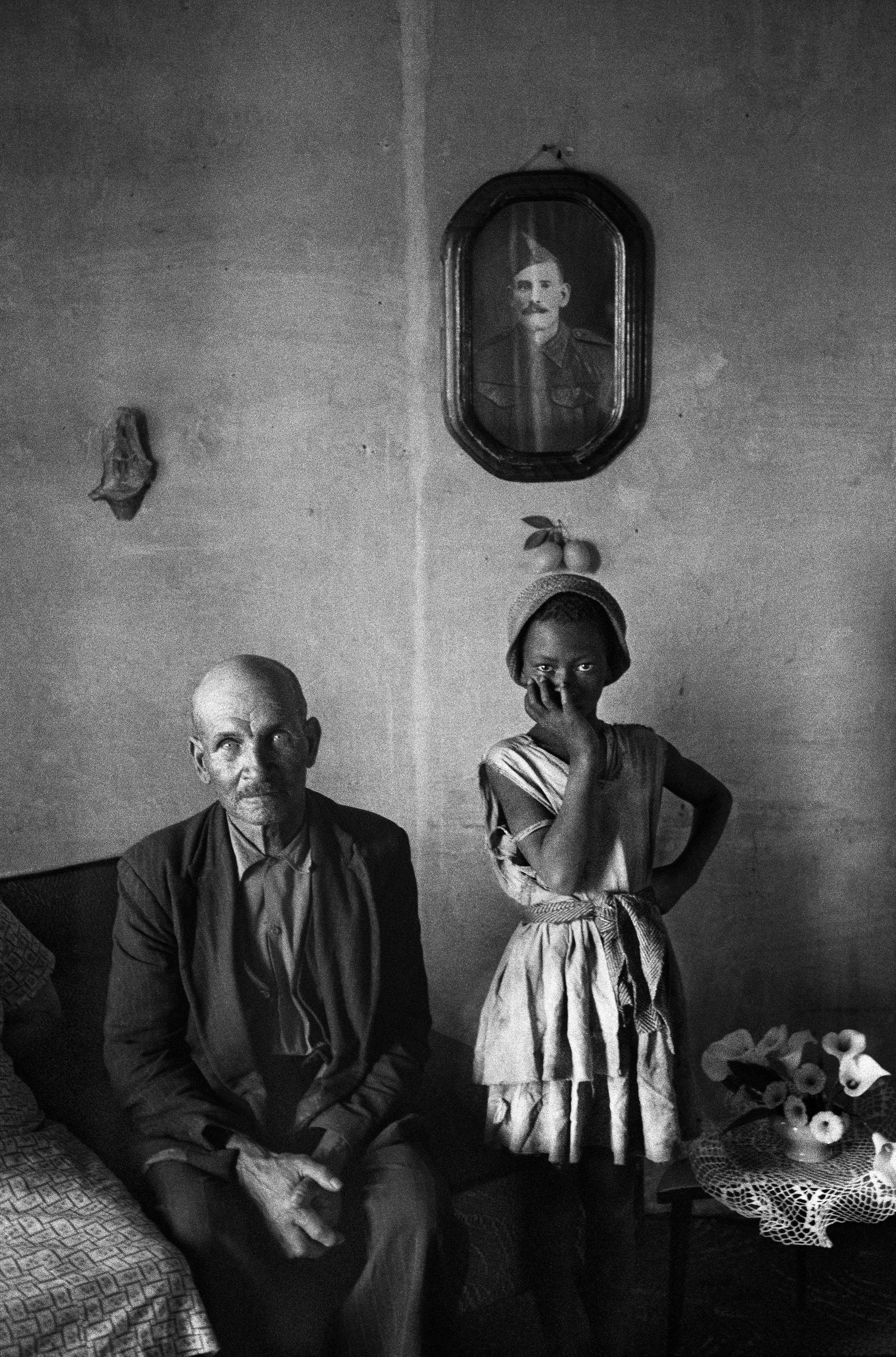 The remarkable image that appears on the book’s cover holds all of these complexities. A sad-eyed white pensioner poses next to his servant’s black child, who coyly covers the lower half of her face. A seam runs down the stained wall behind them, splitting the picture in two. The child stands directly under an old photo; from the caption, we learn that the man in that photo—the only photo decorating the wall—isn’t the pensioner’s ancestor but rather his wife’s first husband.