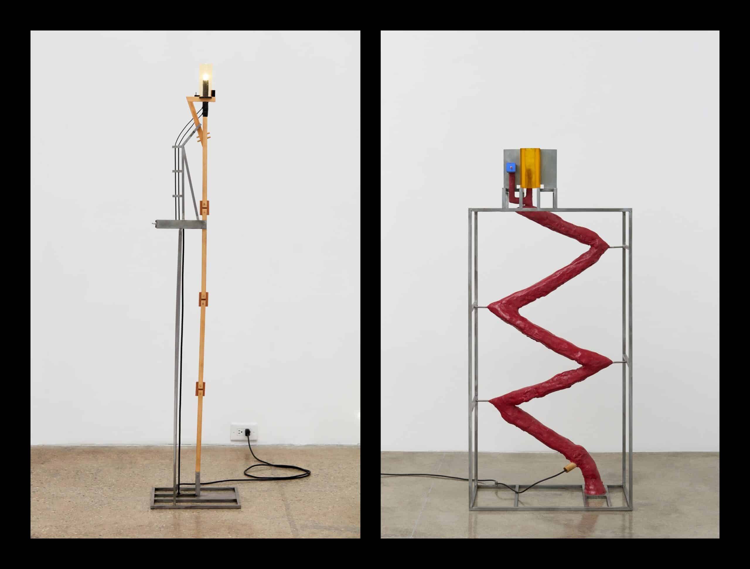 Three of his lamp-sculptures command the space. Steel, resin, plexiglass, plaster. Already present during his Pace debut in 2022, they only half illuminate. They do what Lynch always did: carve pockets of shadow rather than simply bring light. Step closer, and the light retreats.