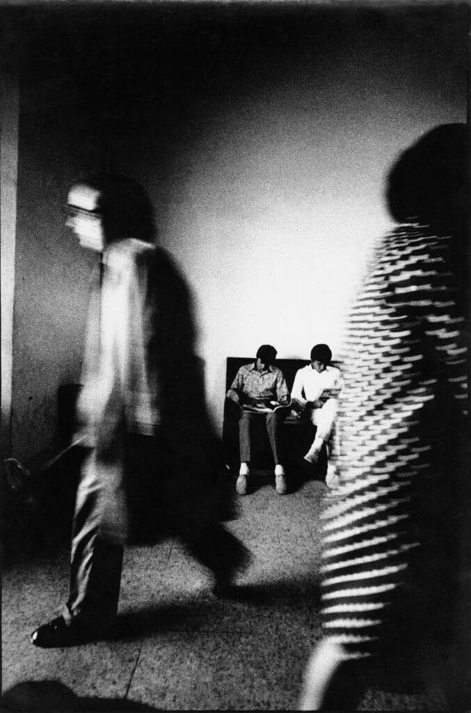 This dual lineage — architectural and pictorial — engenders an approach at once ascetic, experimental and political towards the Italian territory. Appointed permanent photographer at the IUAV in 1970, Guidi pursues his research along “two directions.” On the one hand, his intimates caught di sguincio (at an angle) in a spontaneous black and white where movement and blur prevail.