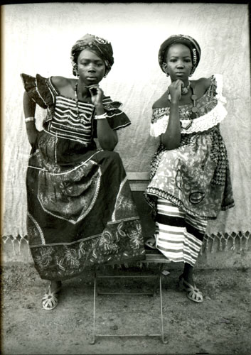 The photographer worked primarily in natural light — in the courtyard of the house, under the pure radiance of the Sahel. For artificial light, he had three lamps, which, according to one of his now-octogenarian clients, Madame Souncko Fofana, “amazed us, especially since there was no electricity here except at the Governor’s house and at the cinema.” His portraits of women were a high point. Keïta photographed them in ceremonial dress, adorned with gold jewelry, draped in hand-woven fabrics or bazin. The two Senegalese women who lived in the Wolof neighborhood, his brother Abdoulaye recalled, “had a habit of pestering Keïta every day to be photographed.”