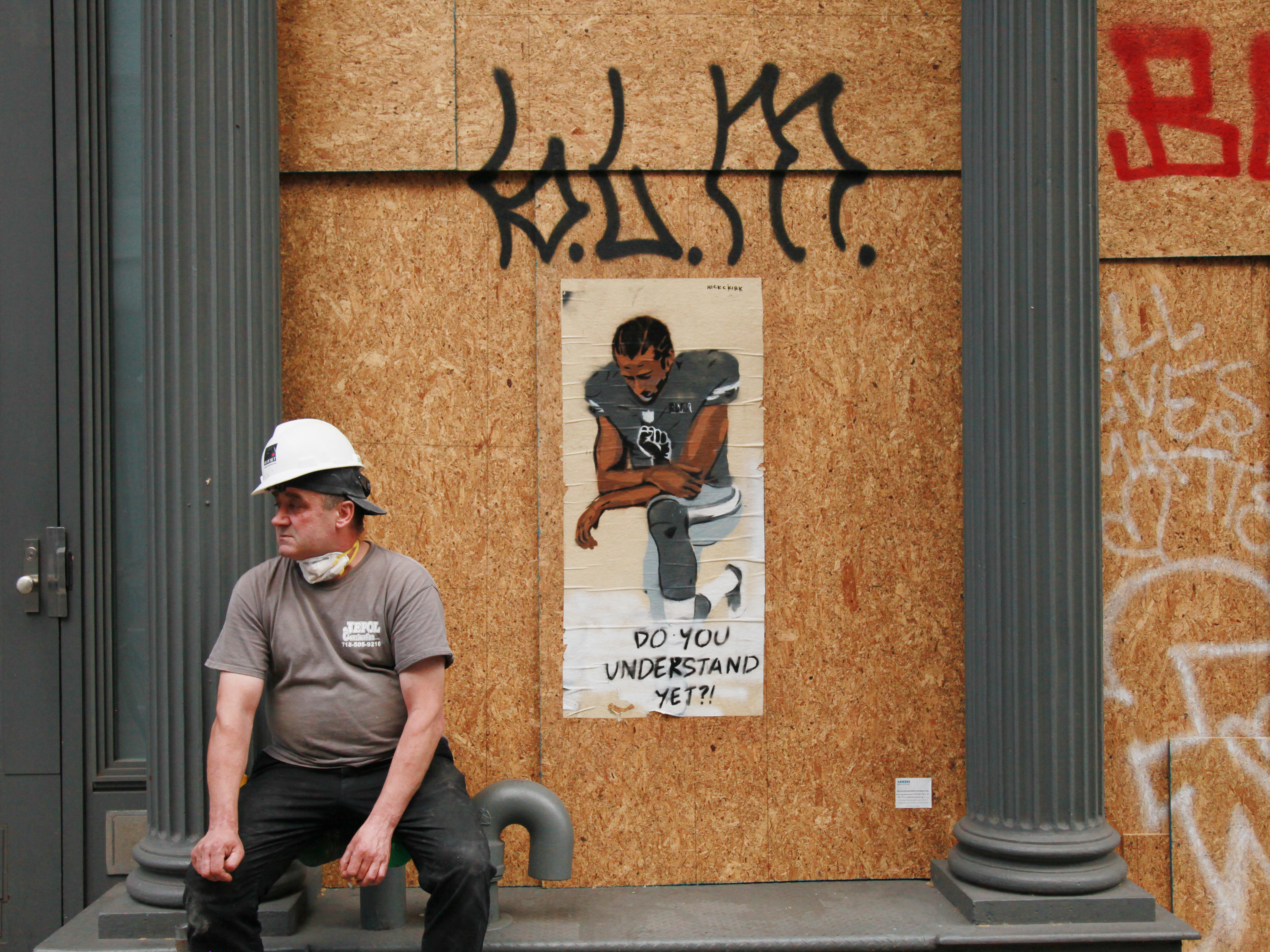 “In 2020, we have seen a big uptick in political content reflecting the aspirations and critical voices of society. We saw portraits of George Floyd, lists of names of citizens brutalized or killed by police, statements like ‘I can’t breath’ – without attribution. It’s not about their identity or career,” Rojo and Harrington say. “In a way, the work is more poignant and powerful because it doesn’t ask you to do more than consider the message — like the hand-painted portrait of football player Colin Kaepernick kneeling in his team uniform with his head down, accompanied by the simple text, ‘Now do you understand?’”