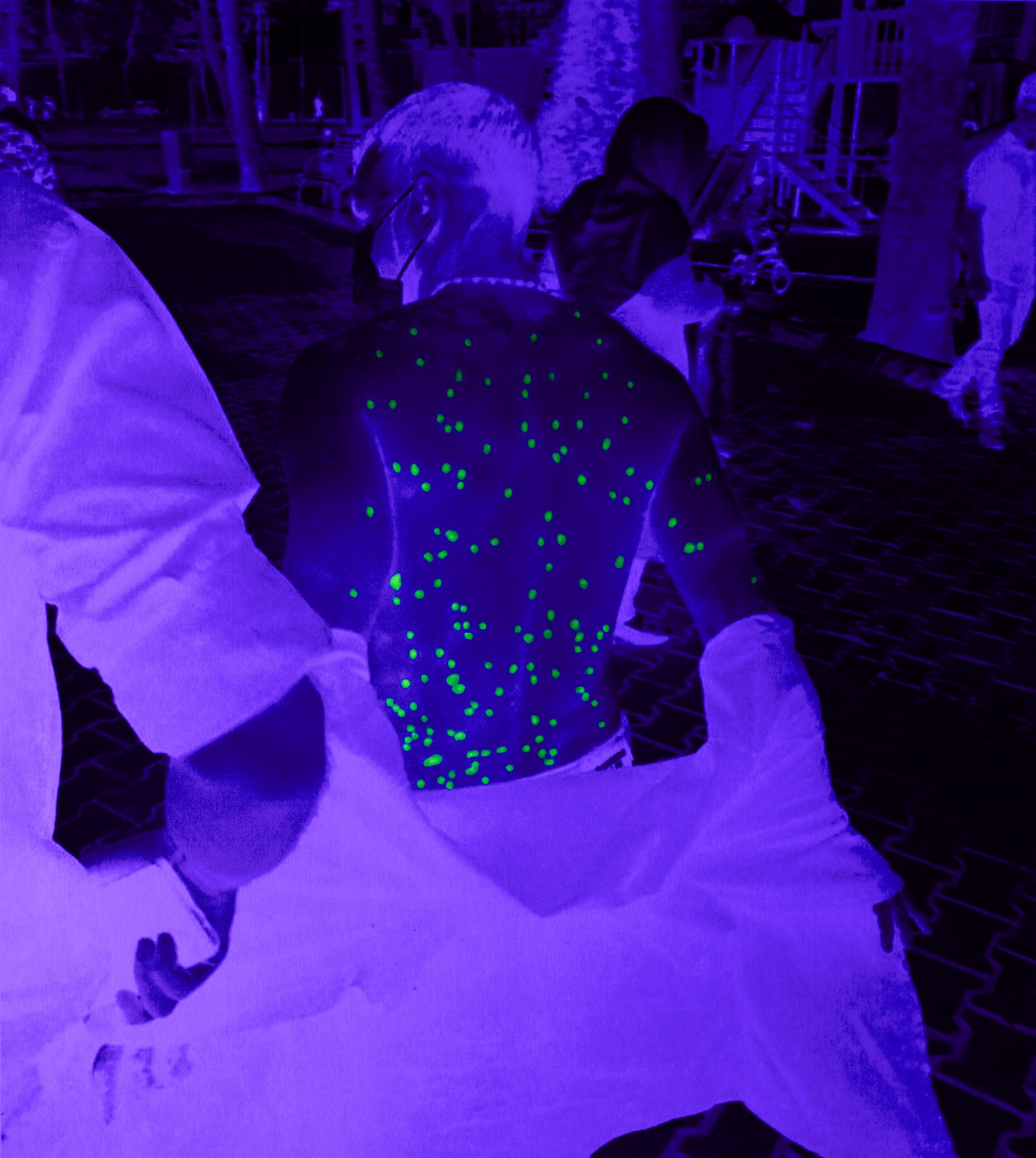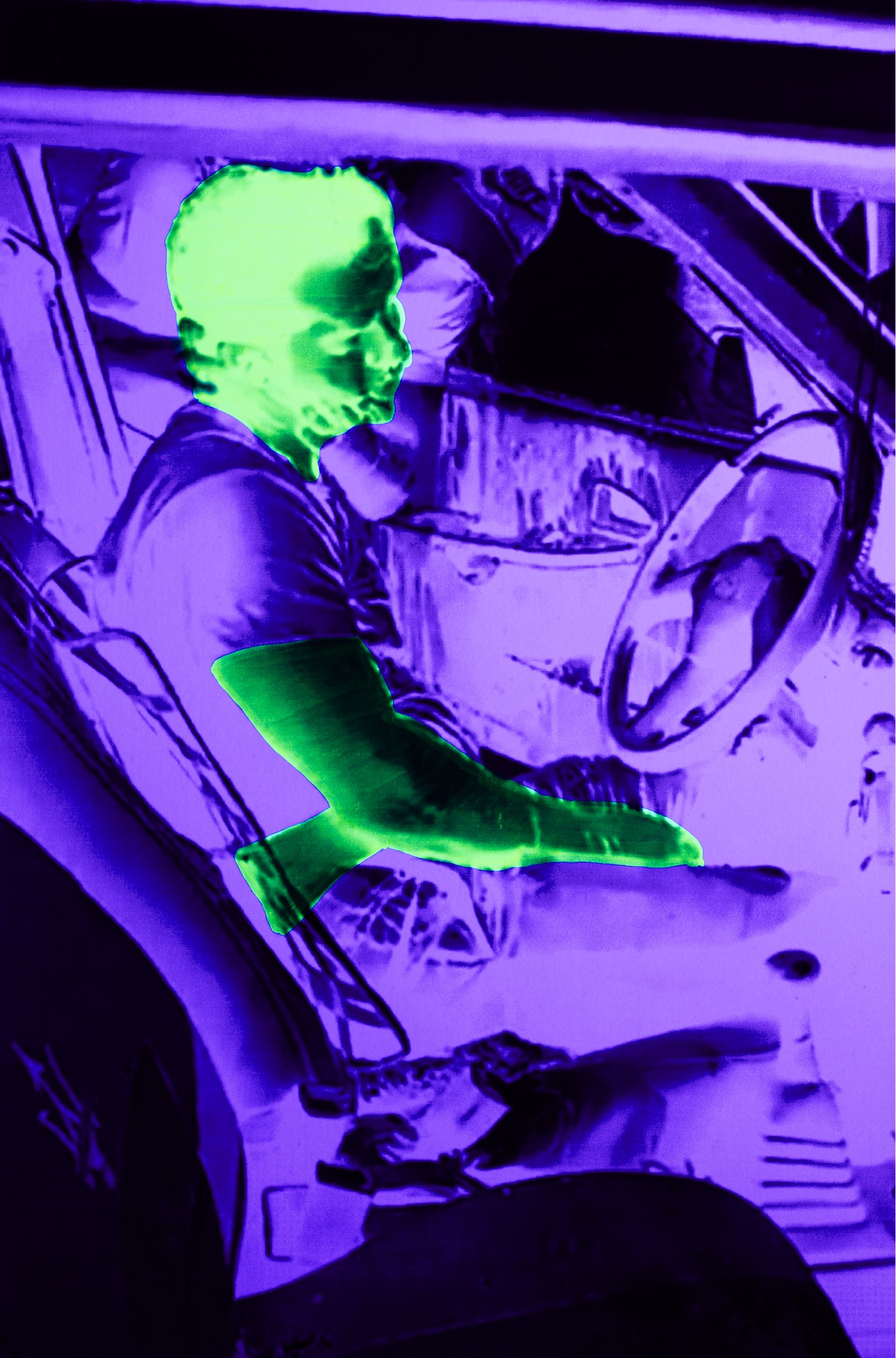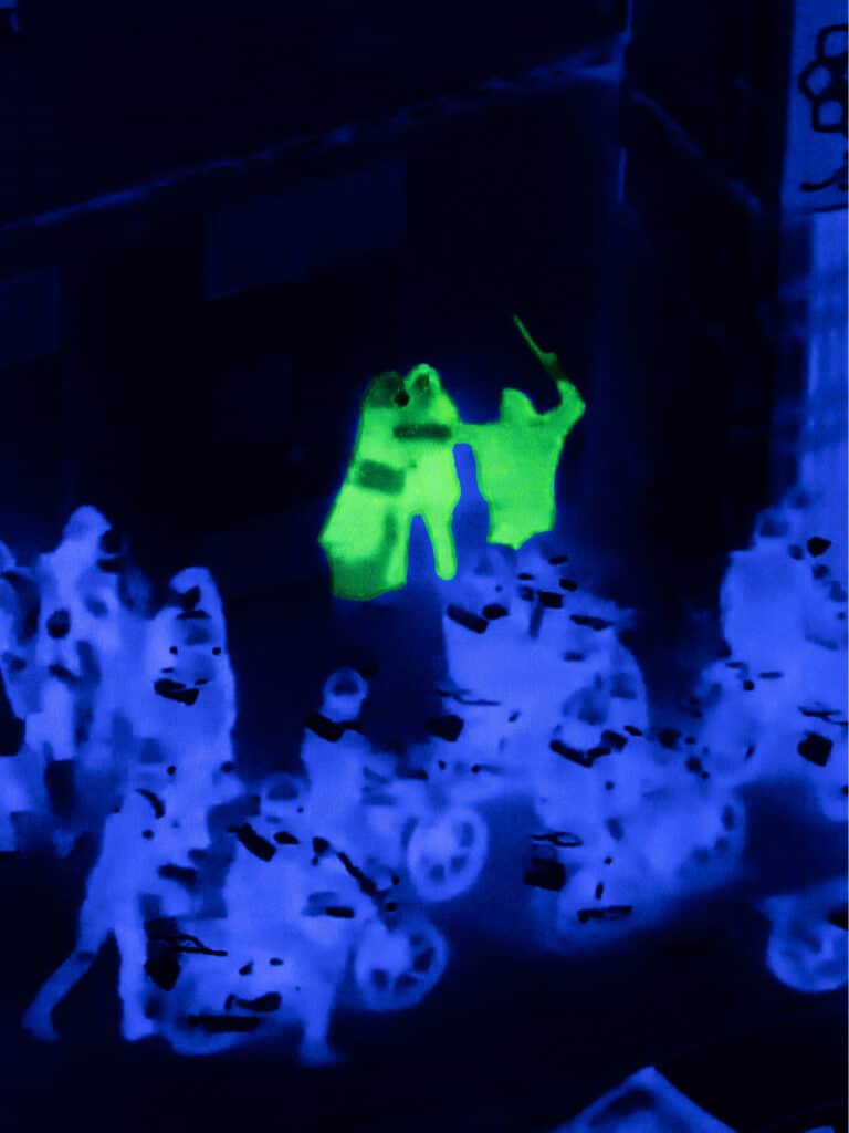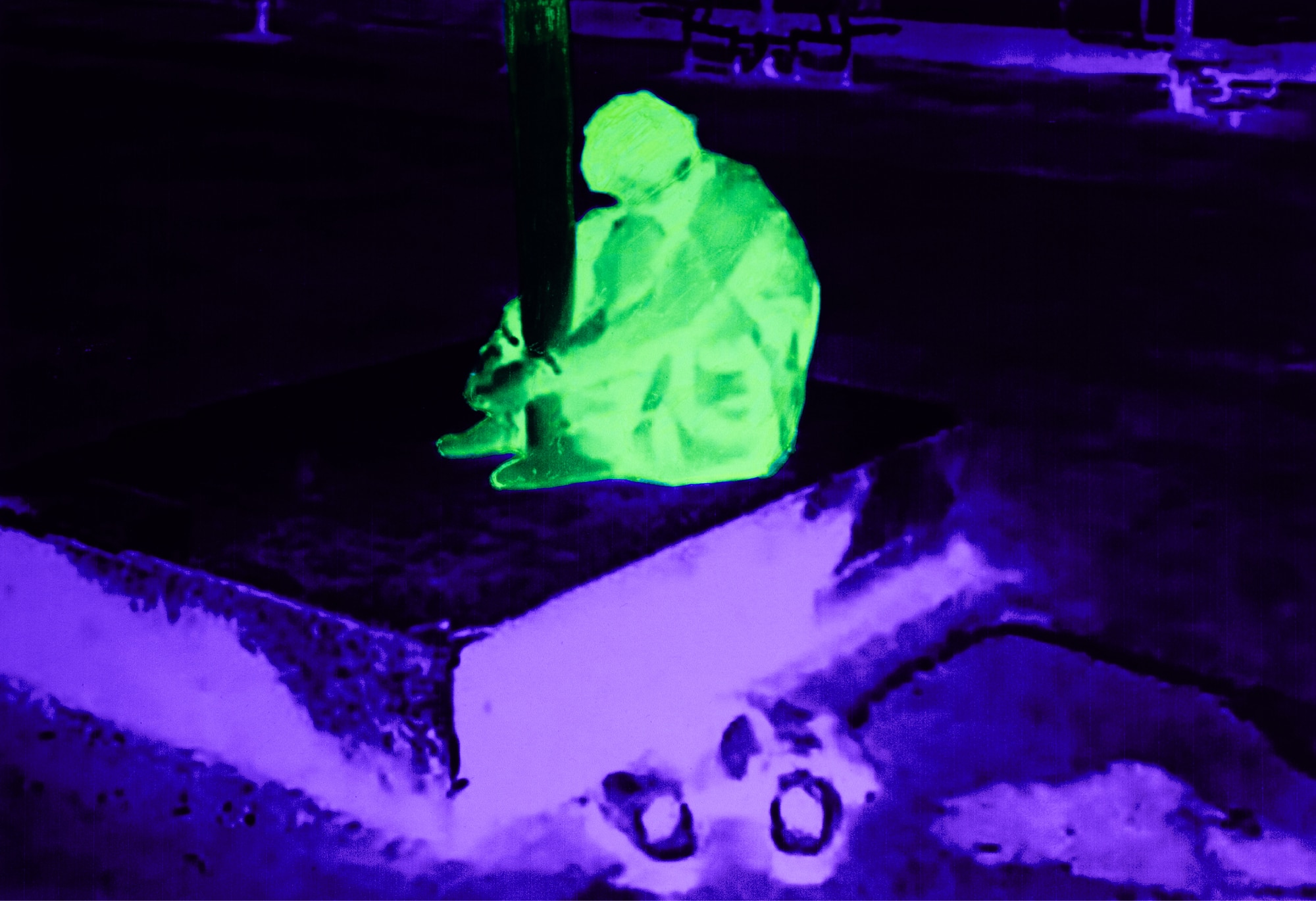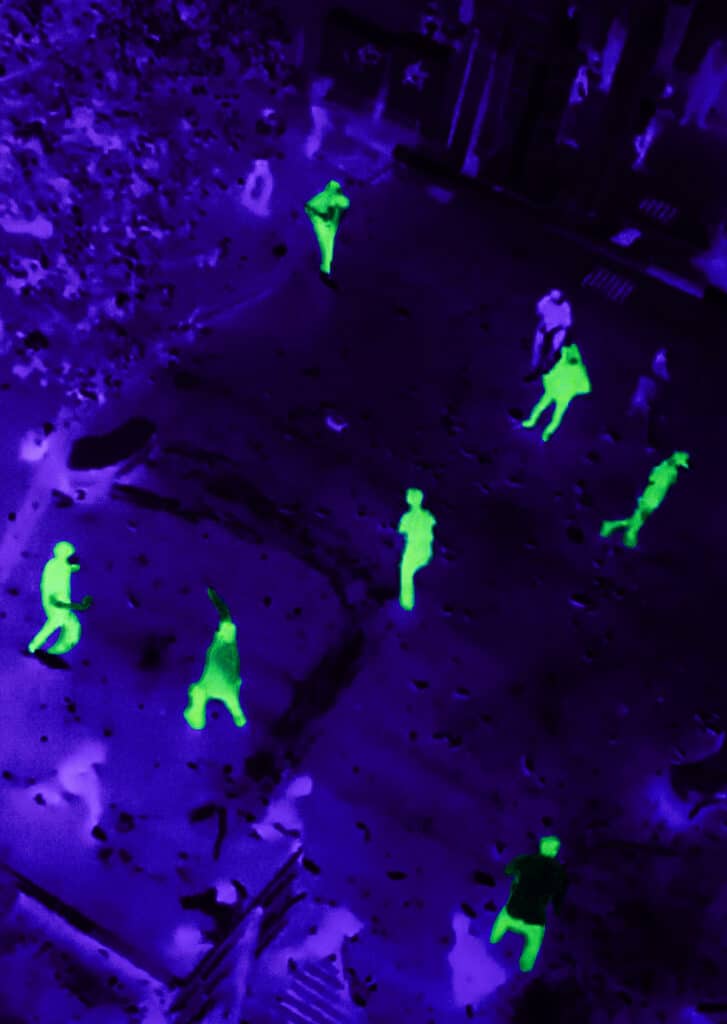 These fragments are then physically reworked. Ultraviolet light and UV-reactive ink are applied to the surface of the images, activating only certain zones, certain gestures, and certain bodies. “These images are reanimated using ultraviolet light and UV-reactive ink, uncovering hidden truths that only become visible when the perspective shifts.” The technique is never neutral. It turns the photograph into an unstable object, dependent on light, angle and distance. What can be seen in one moment may vanish in the next. The image behaves exactly like the digital traces from which it originates.