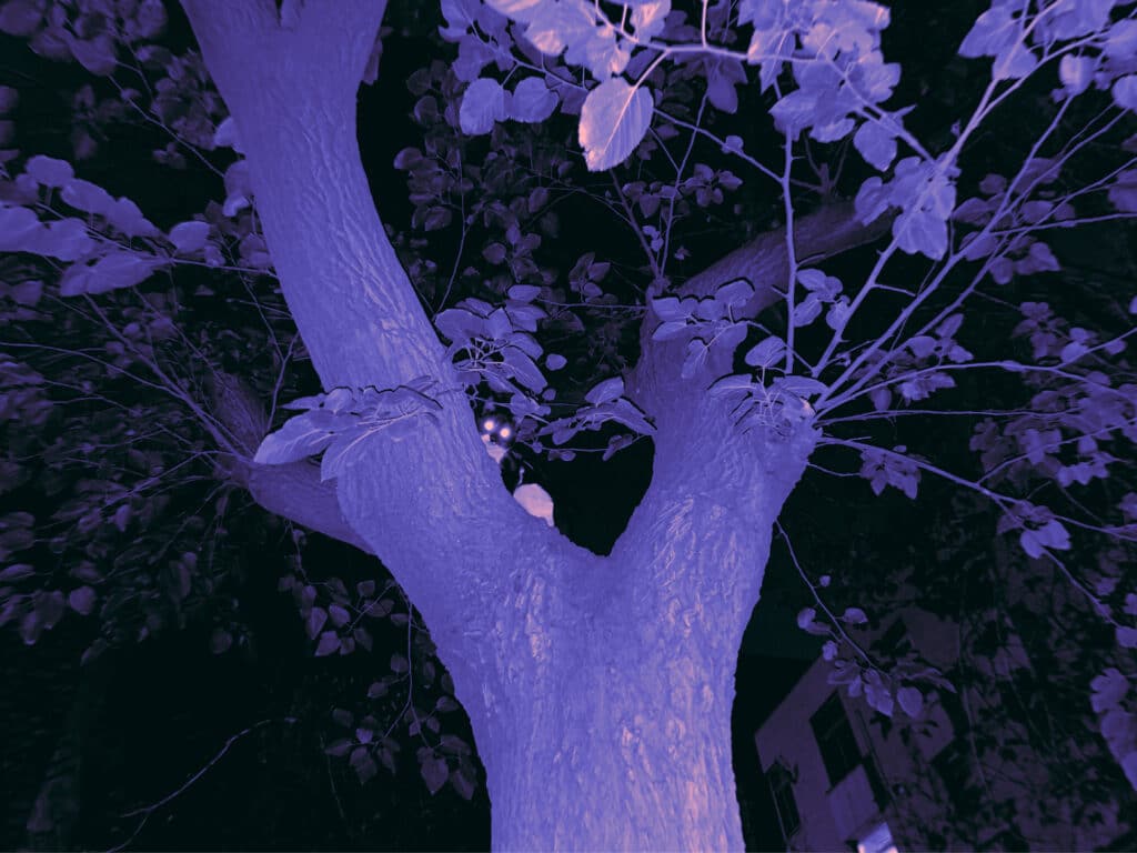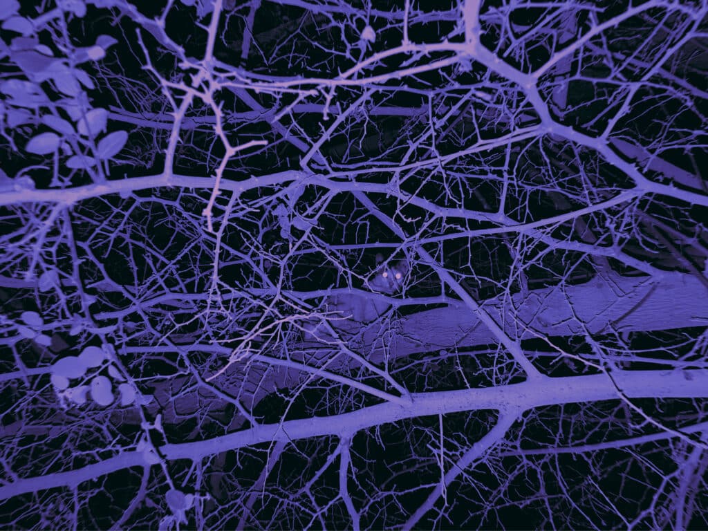 Across the series, the fluorescent figures seem to flicker between presence and erasure. Their contours resist fixation. They glow, but they do not fully materialise. The image behaves like memory under pressure — unstable, incomplete, constantly threatened by disappearance. At the margins of the compositions, the animals continue to return. Silent, peripheral, persistent.