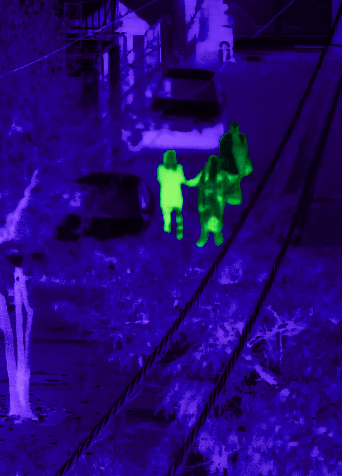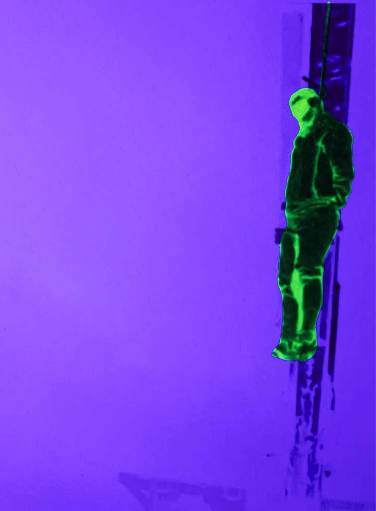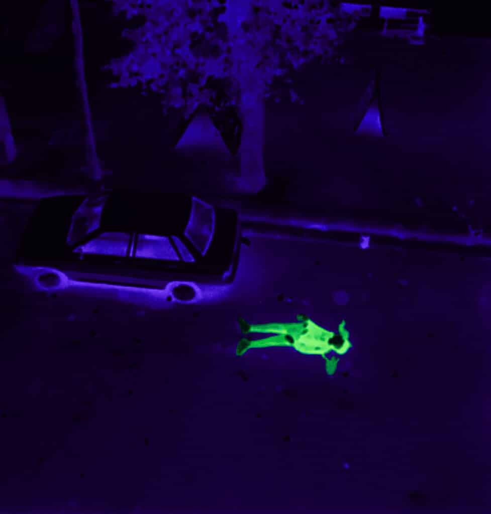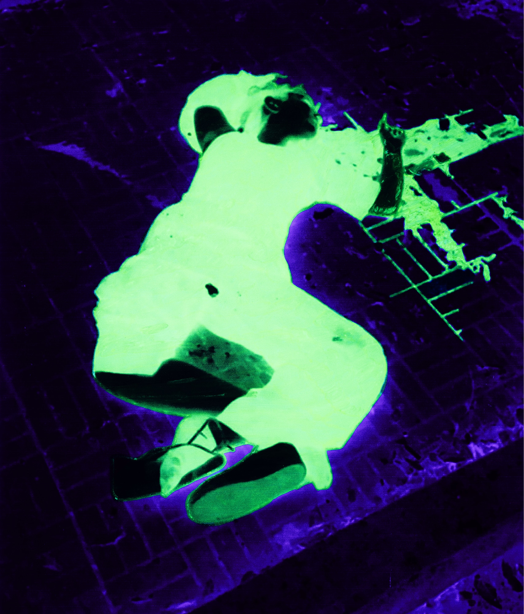 Overall, what cannot be shown becomes the center of the image. A glowing silhouette seems to run through an empty street. A fragment of a body dissolves into colour. A fluorescent stain hovers above a wall, where the human figure should be. The viewer is forced to supply what is missing. The photograph no longer offers proof. It becomes a fragile trigger.