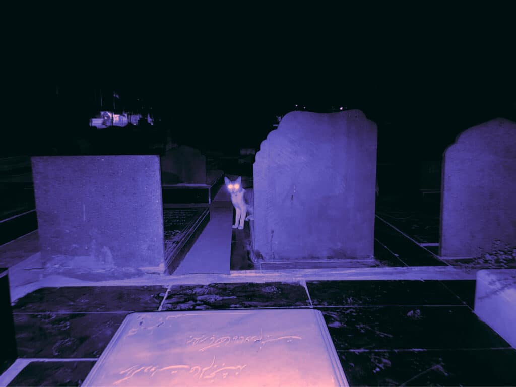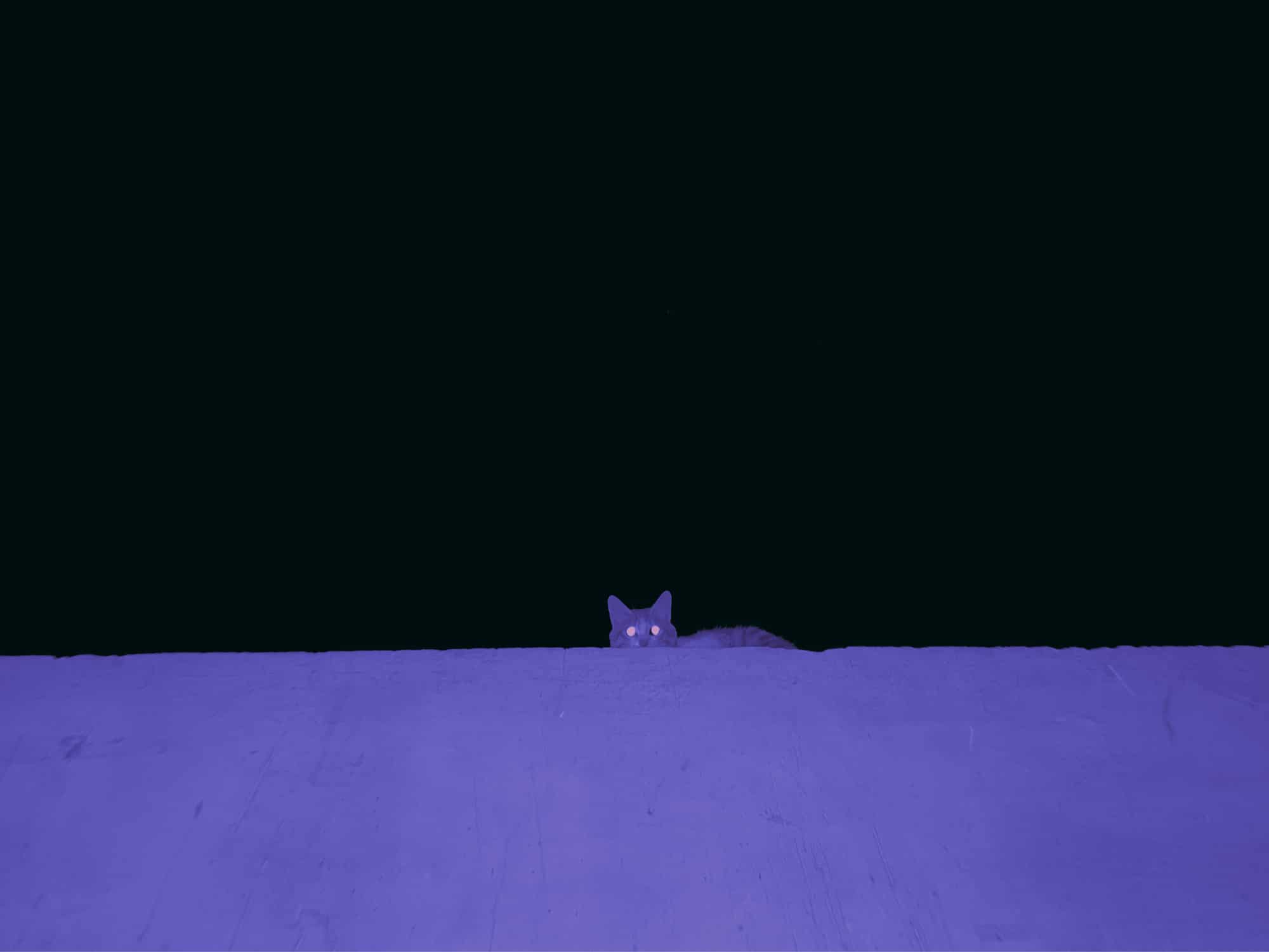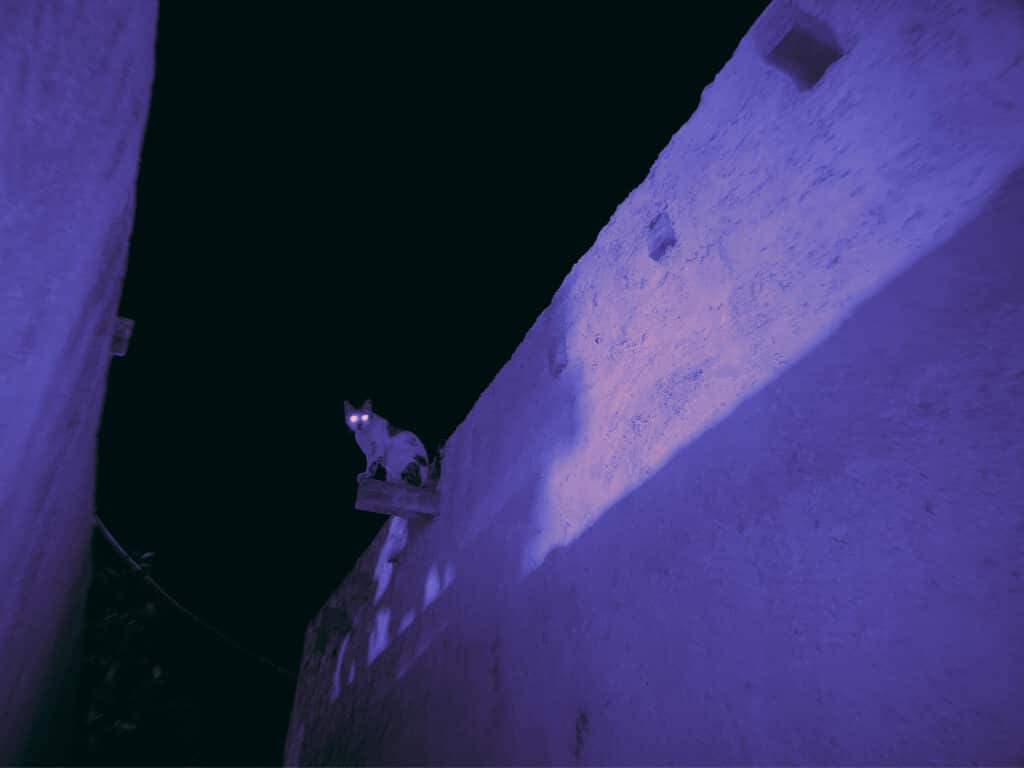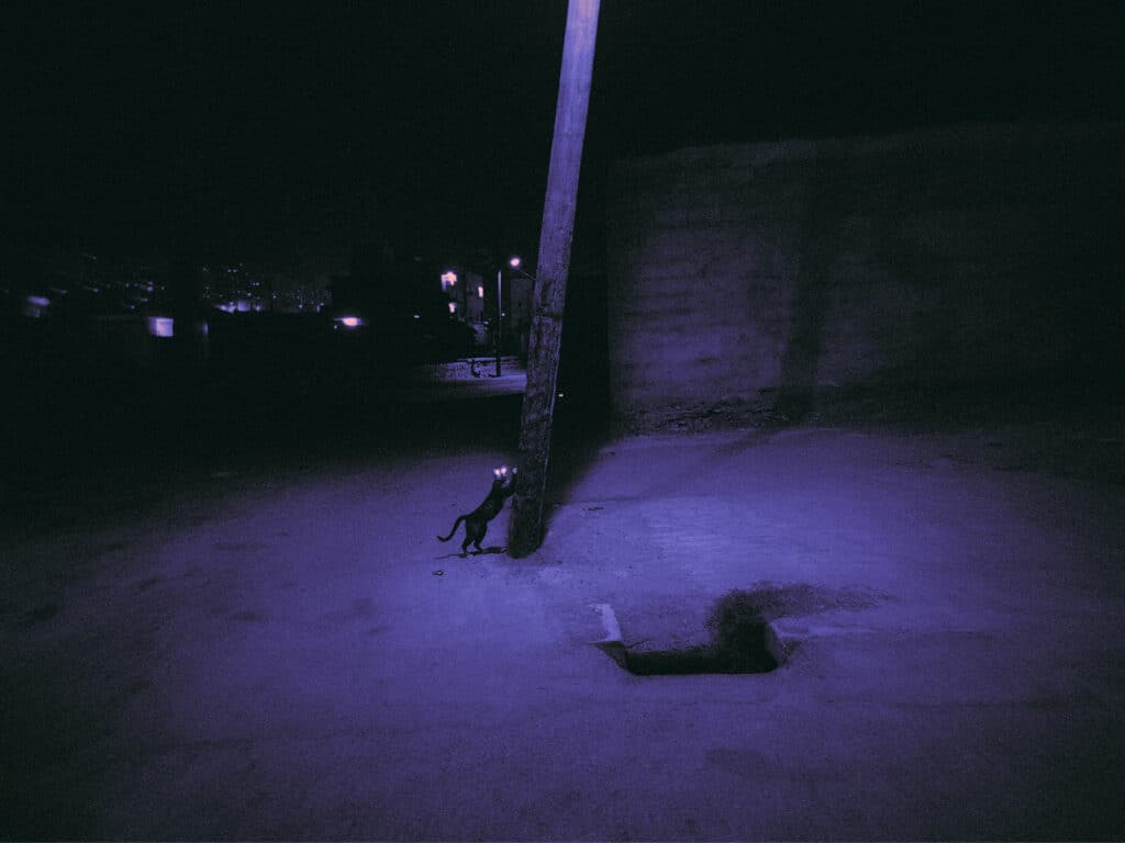 The cats move freely through emptied spaces. They cross thresholds long after crowds have dispersed. They linger in stairwells and under streetlights. Their presence is minor, almost insignificant. Yet it is precisely their indifference to spectacle that allows them to remain. “For me, the cats carry both a cultural and personal reference. When people think of Iran, a few iconic things come to mind—such as Persian rugs and Persian cats. Another reason is that when you look at the map of Iran on the globe, the country itself resembles a cat.”