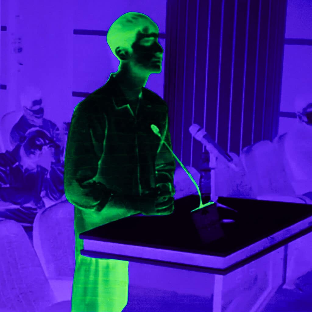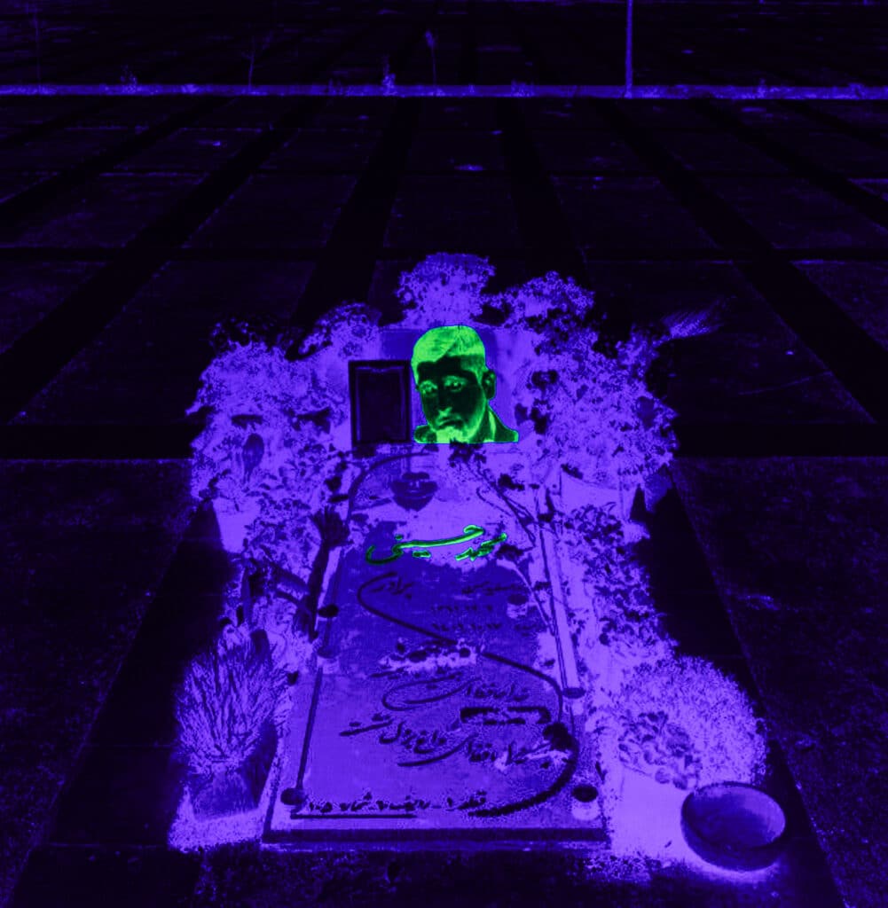 The entire visual structure of “26/01” is built around this instability. Masofi insists that the technical process is inseparable from the political context in which the images circulate. “The technical process — printing the images, applying UV-reactive ink, and re-photographing — is entirely in service of the concept,” he explains. “These elements are not decorative, but an extension of the core idea: hidden truths emerge only when perspective shifts. By using UV light, I wanted to reveal the hidden or suppressed truths through a fresh way of seeing.”