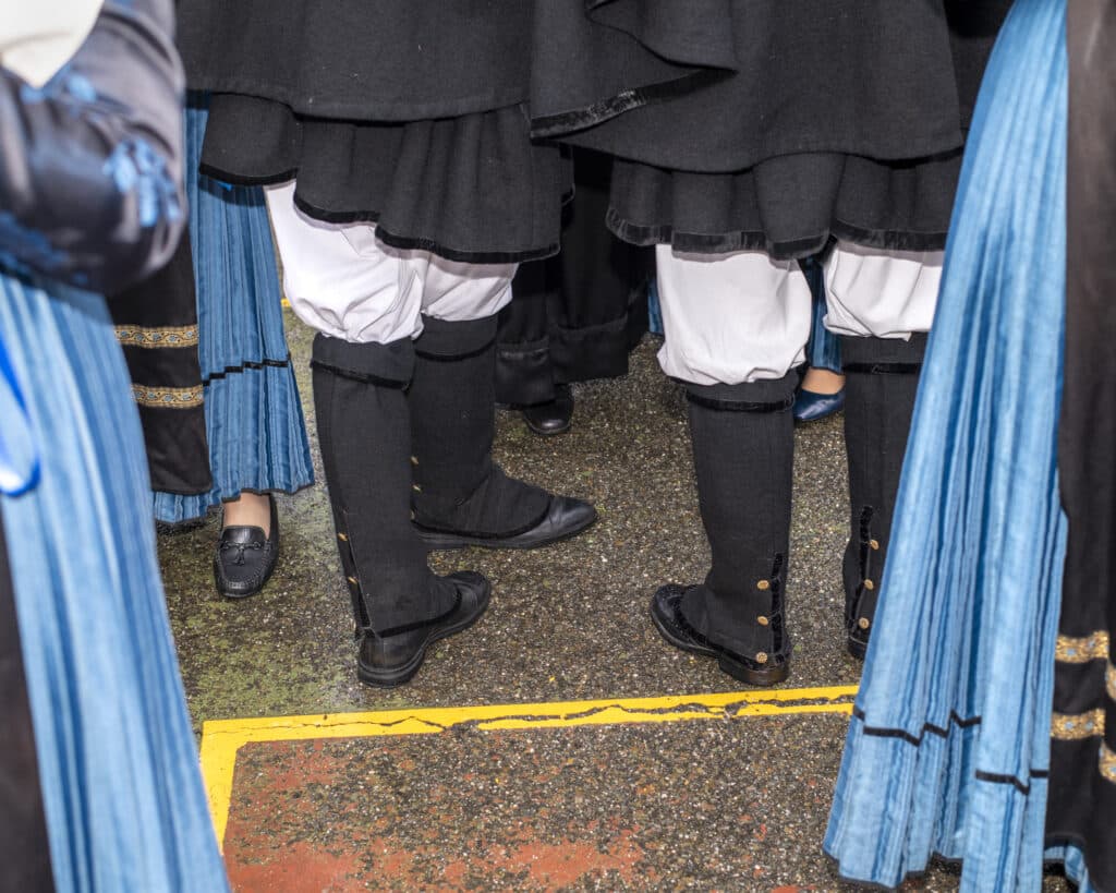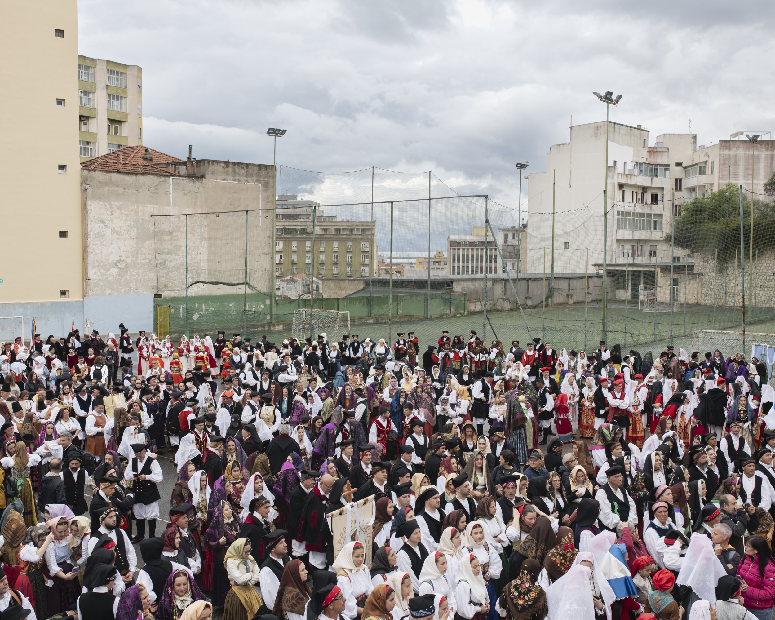 Les groupes folkloriques se sont rassemblés dans la cour de l’Institut Salésien Don Bosco avant le début du défilé, Fête de Sant’Efisio, Cagliari. Série Brigantinas 2025. © Nicola Lo Calzo