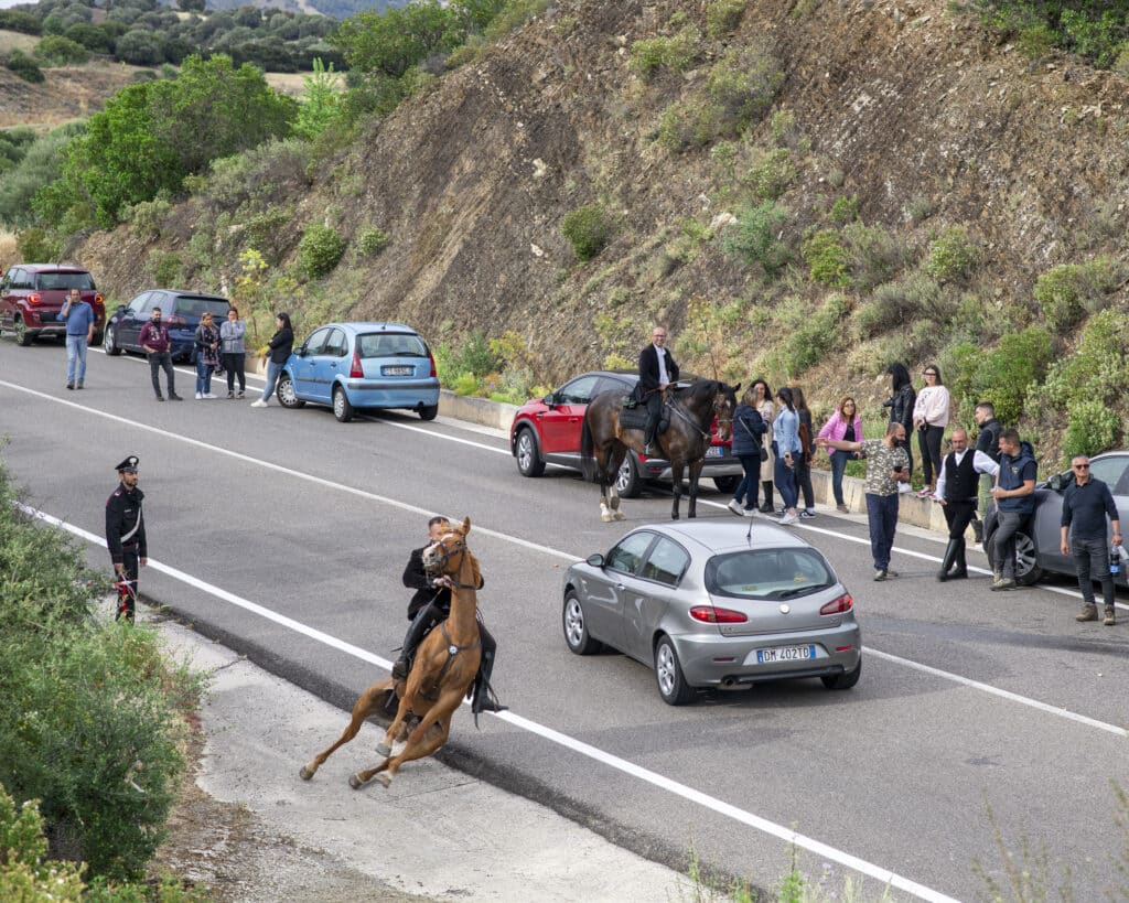 Accident de cheval sur le chemin de pèlerinage vers le sanctuaire de San Francesco di Lula. Série Brigantinas 2025. © Nicola Lo Calzo