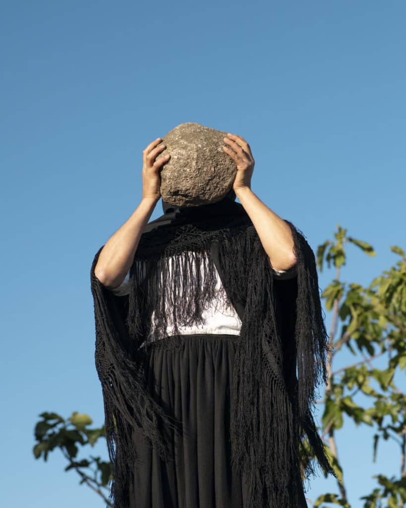 Une silhouette drapée de noir se dresse face au ciel sarde, les bras levés, tenant dans ses mains un roc. L’actrice Vittoria Marras rejoue dans une performance vidéo l’insurrection de Paska Zau, paysanne de 60 ans qui mena en 1868 la révolte contre la vente des dernières terres communales de l’île. La scène condense le geste de Nicola Lo Calzo : saisir l’instant où le corps des dominés d’hier se redresse contre l’effacement.