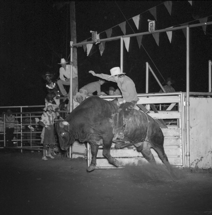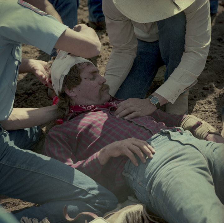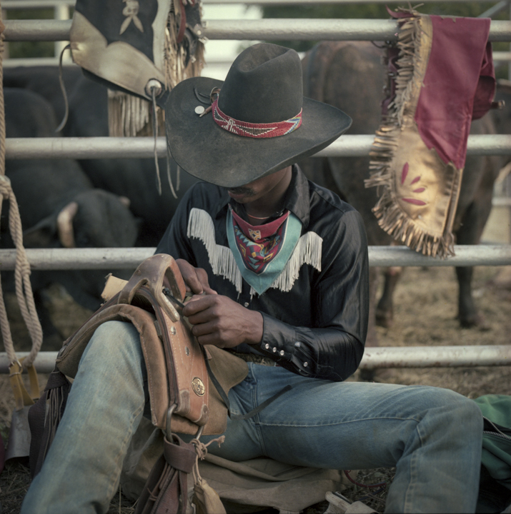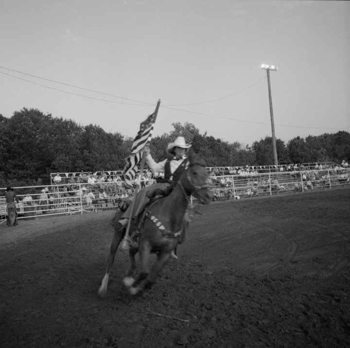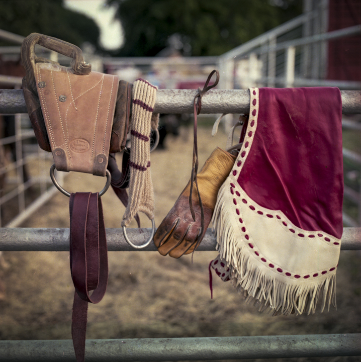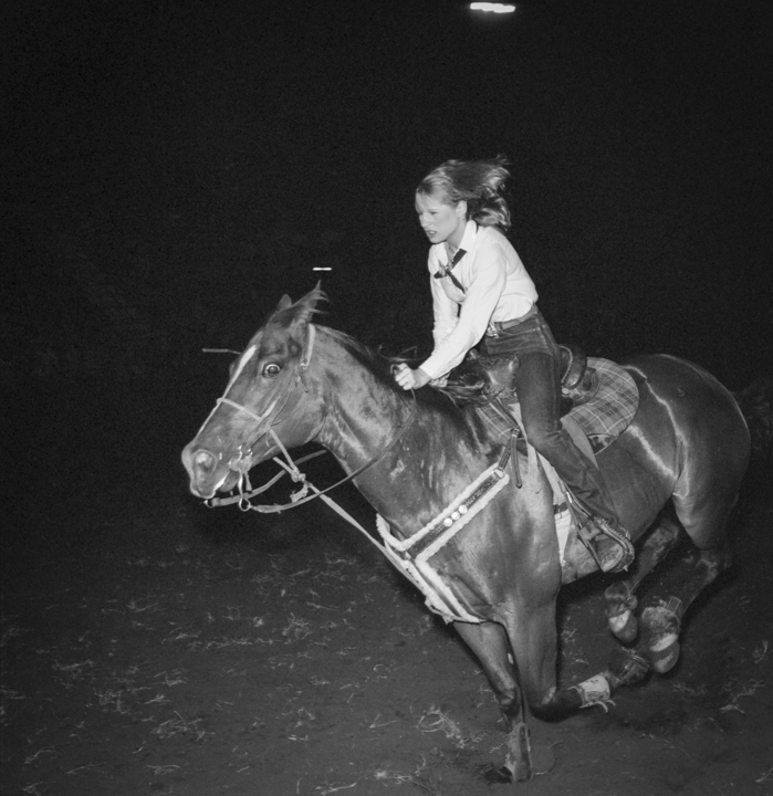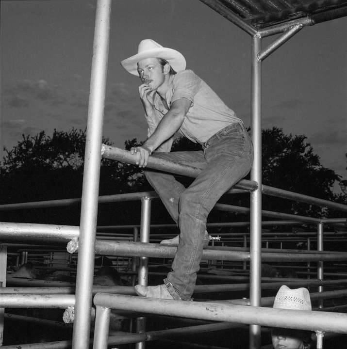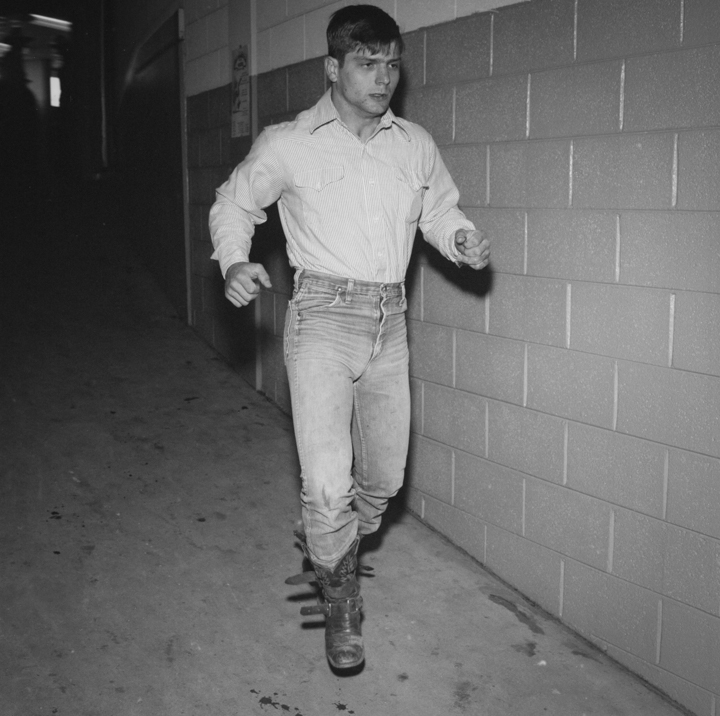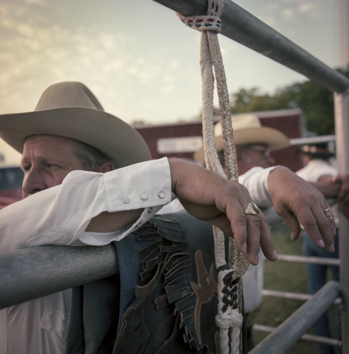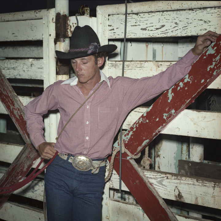 Des décennies plus tard, John Dyer est photographe commercial depuis près de cinquante ans lorsqu’il décide de suivre cette mémoire jusqu’à sa source. « Il était presque inévitable que je photographie le rodéo », dit-il. En 1983, il convainc sa femme — « bonne âme qu’elle est », précise-t-il avec une tendresse sans détour — de l’accompagner sur les routes du Texas puis du Montana avec leur fils encore nourrisson. Photographier le rodéo devenait une façon de l’initier à ses origines. « Je me souviens avoir ressenti une vraie fierté en leur montrant cette partie de là où je venais », raconte t-il.