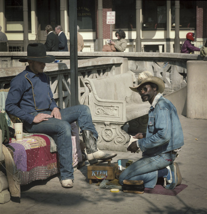 Ce qui rend ces images irremplaçables tient aussi à une économie de moyens radicale. Son Hasselblad 500C à mise au point manuelle, ses objectifs Zeiss Sonnar, son film Kodak Ektacolor 120 — douze poses par rouleau. « Quand le film, les produits chimiques et le papier d’impression coûtent de l’argent, chaque image compte », dit-il. Cette contrainte impose une lenteur, une présence au seuil. « La photographie consiste à faire attention et à réagir exactement au bon moment » — une leçon héritée de ses deux grands maîtres à l’Université du Texas : Russell Lee et Garry Winogrand.