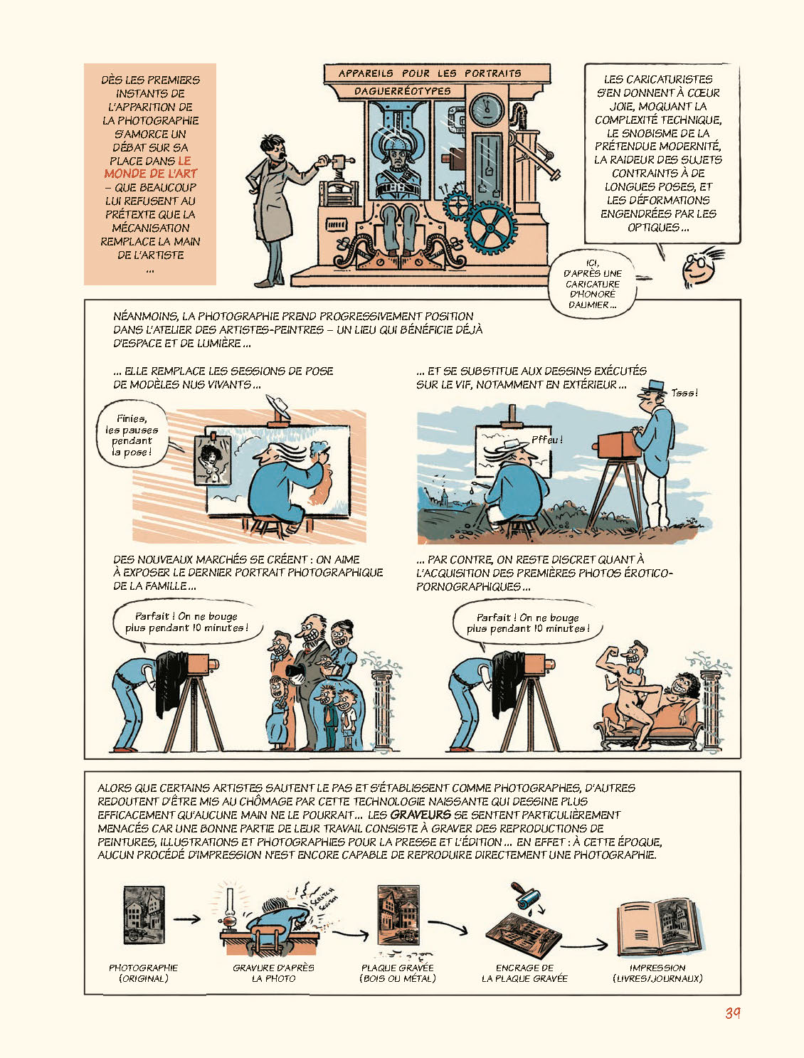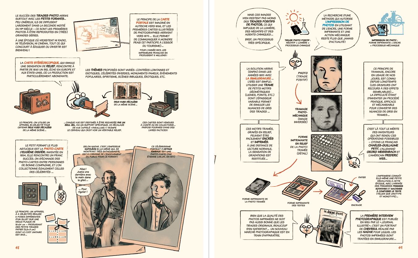 Passionate about images, Vincent Burgeon is a photographer, graphic designer, illustrator, as well as a university instructor in graphic design and photography. In the fall of 2017 his publisher suggested an ambitious project: “How about telling the story of photography in a comic book?” Vincent Burgeon agreed. “Between editorial reflection and technical investigation, the work slowly began to take shape.” An exhaustive approach being out of the question, the cartoonist chose to adopt his own point of view rooted in his personal photography practice, his readings and experiences. “After all, isn’t adopting a point of view precisely what photographers do, but also historians?”