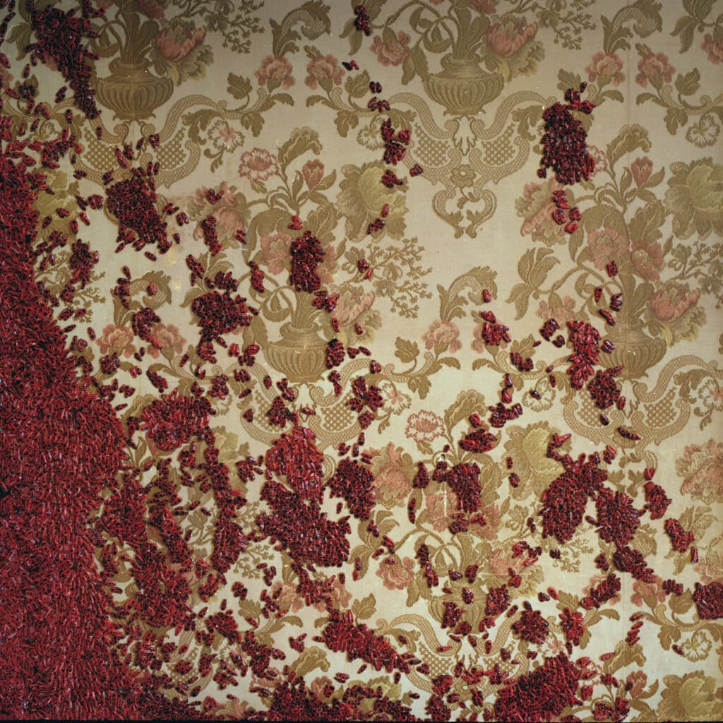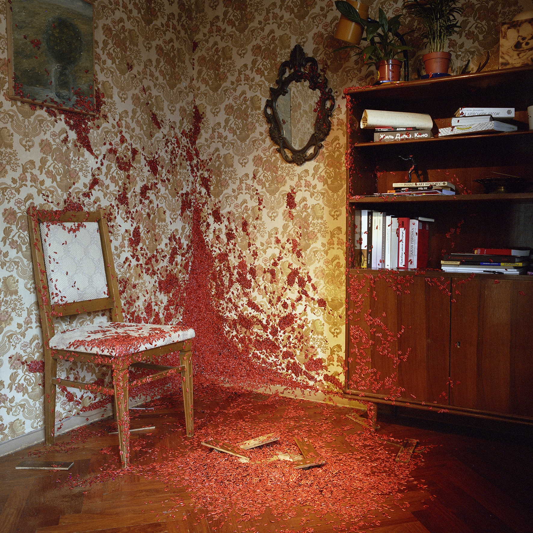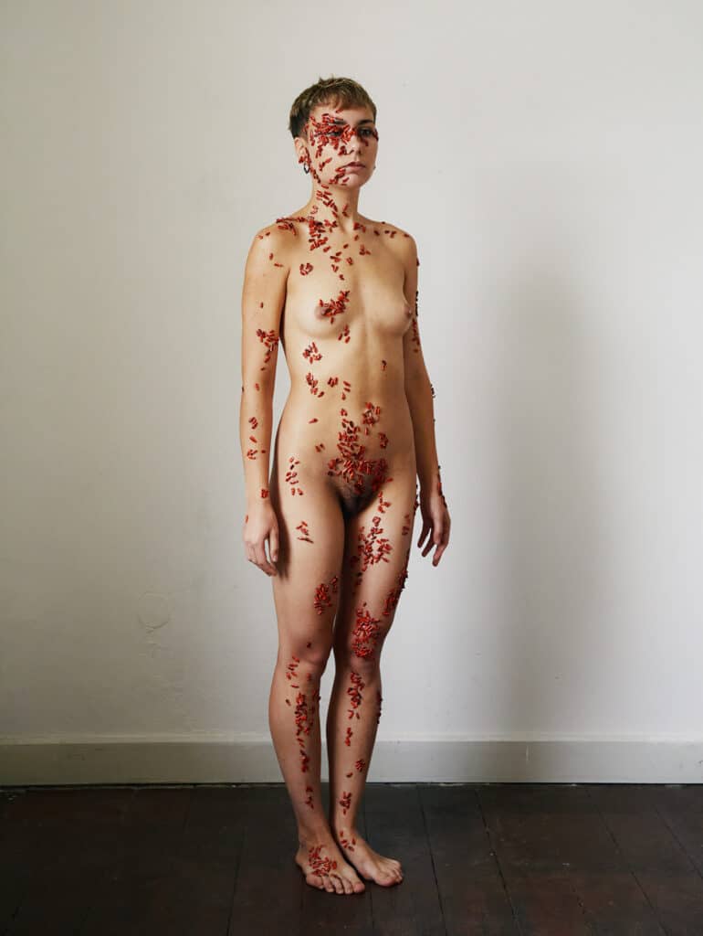 In her mother tongue, firebugs are called “soldier insects, in reference to the military of the Russian Empire, who wore uniforms of similar colors — shimmering orange and black,” the photographer confided. Naturally, then, she turned to these creatures to embody the irruption of an aggressive and implacable force into a given territory. She placed 40,000 firebugs in a room, filling the space with their very real presence. The invasion became actual, the occupation began: “they are small, but numerous, they deploy in an uncontrolled way, they transform the familiar into hostile terrain. We are no longer safe,” Koval summarized. Faced with the images, a feeling of discomfort, then anguish, emerged — emotions she heightened further still by covering a nude body with the insects’ red shells.