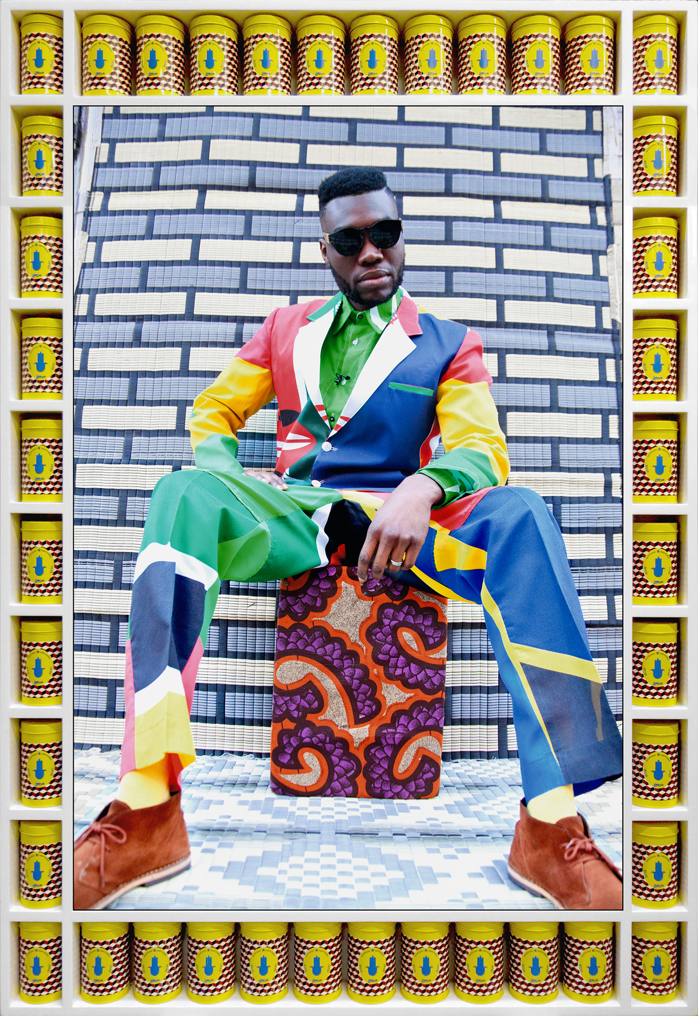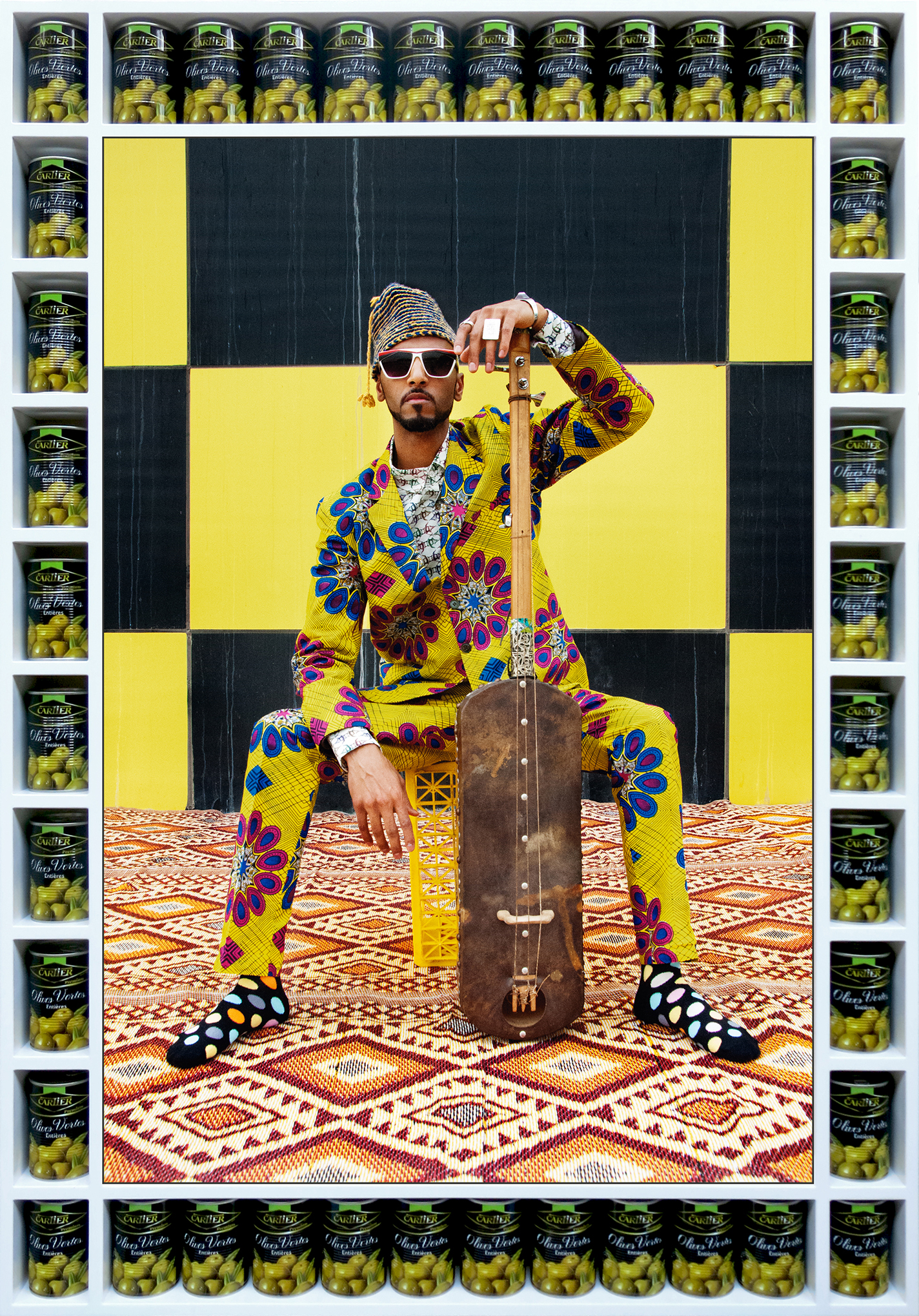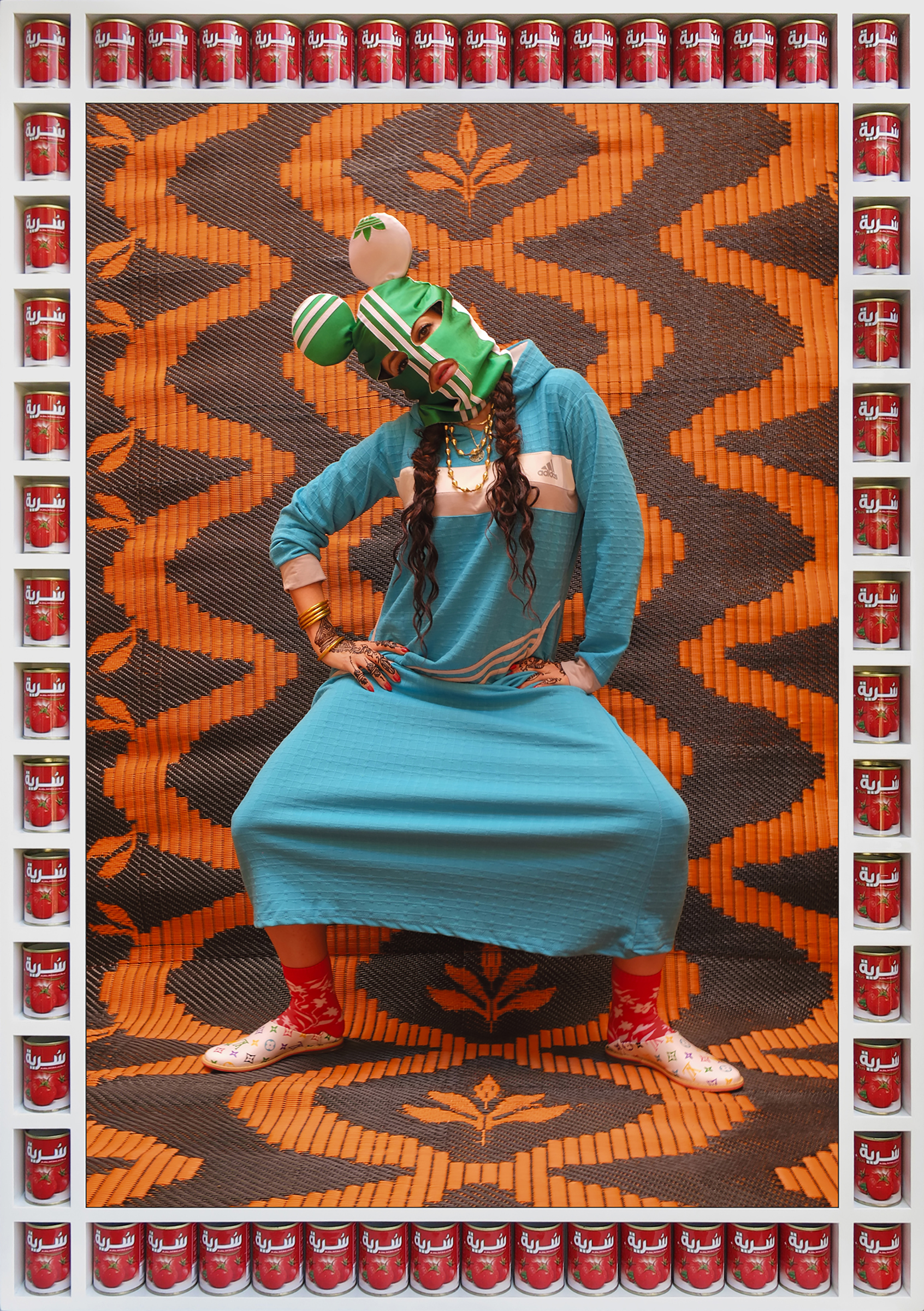 For My Rockstars, Hajjaj picks up where artists like Sidibe, Fosso, and Sanle left off, seeing himself as part of the next generation of master studio photographers — with just one difference. Hajjaj constructs his studios in the street, setting up a stage and backdrops, then invites friends and performers including Cardi B, artist Hank Willis Thomas, and painter Lynette Yiadom-Boakye to don one of his creations and pose for a portrait, then creates a custom handcrafted frame outfitted with miniature shelves and actual products such as soda cans and tomato sauce, often with Arabic logos.