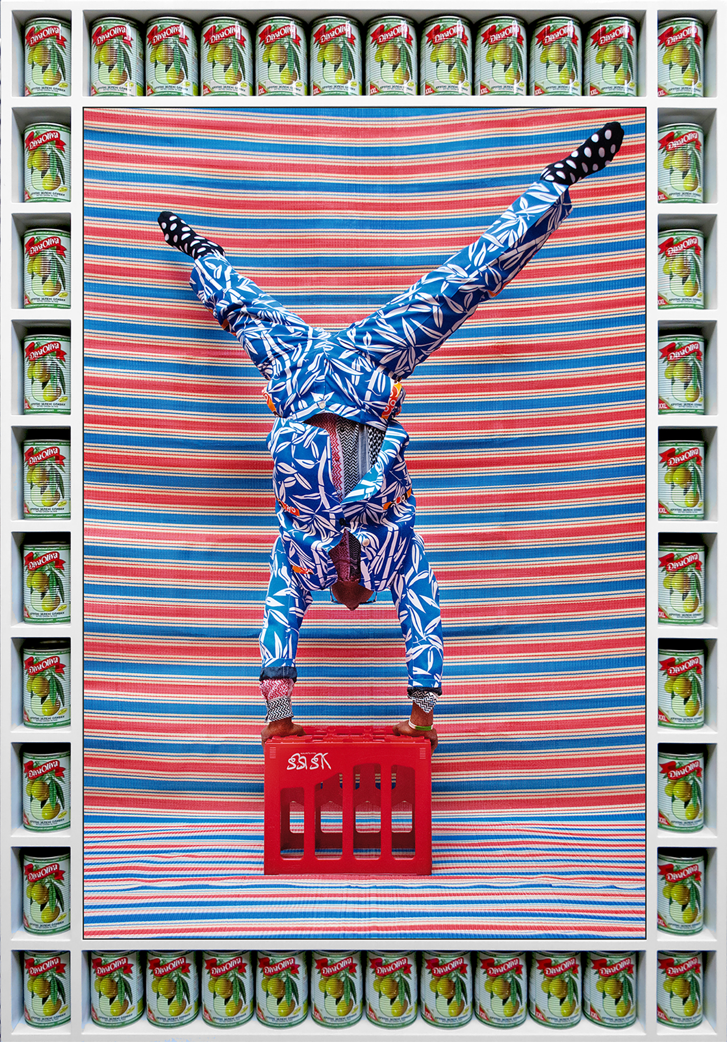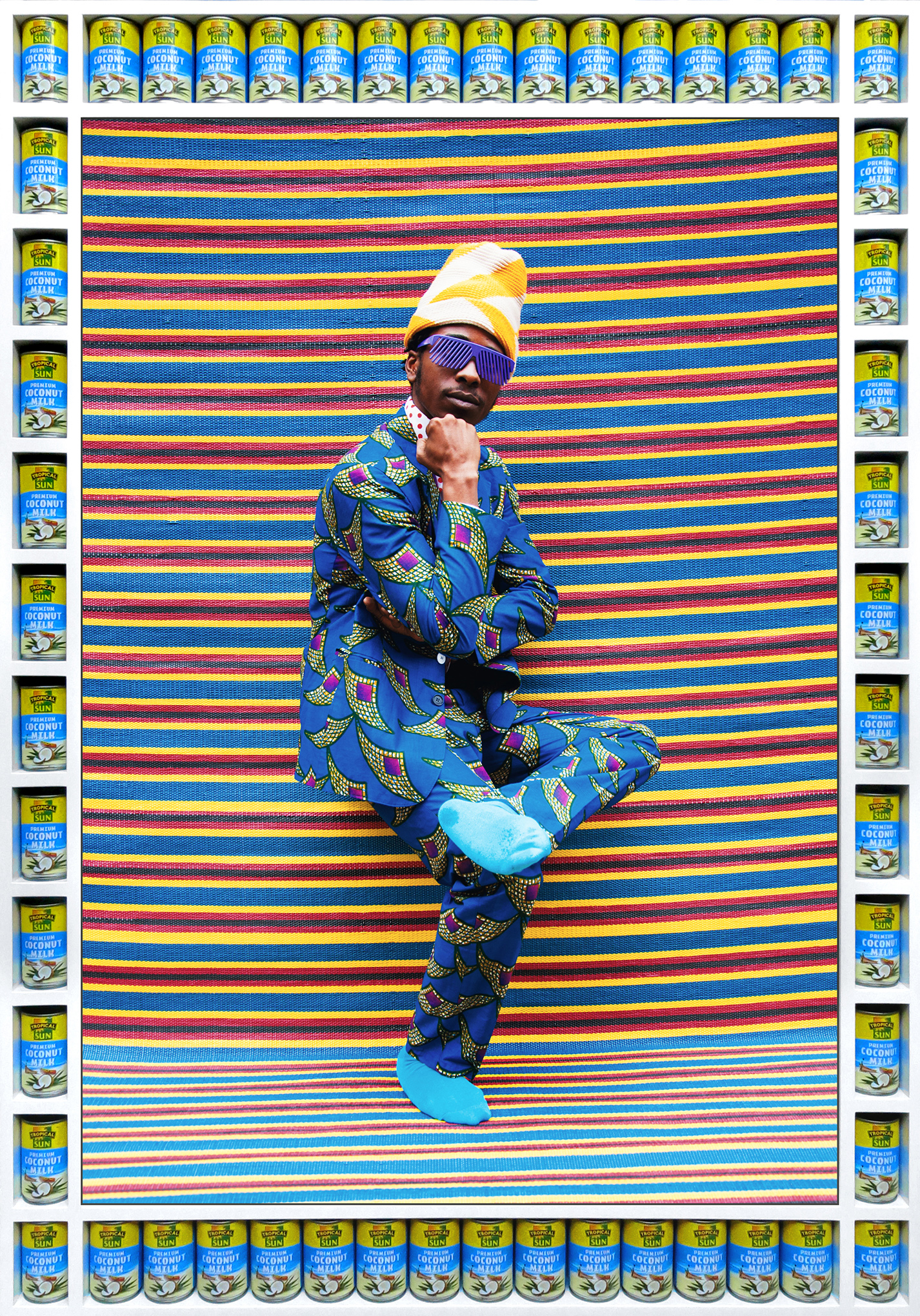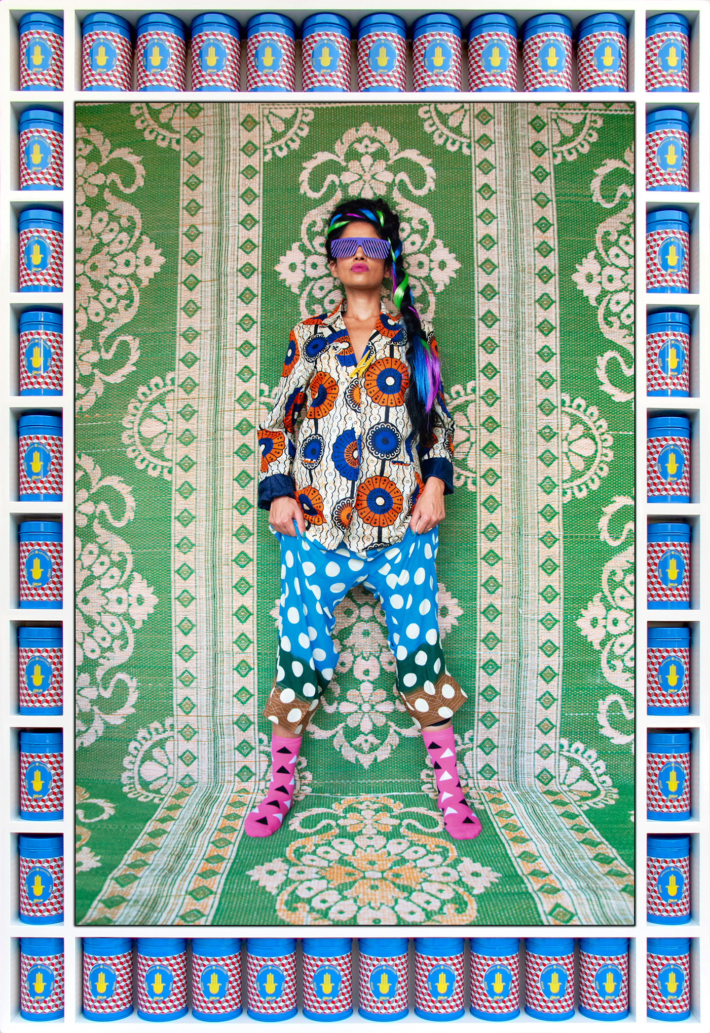 For My Rockstars, Hajjaj picks up where artists like Sidibe, Fosso, and Sanle left off, seeing himself as part of the next generation of master studio photographers — with just one difference. Hajjaj constructs his studios in the street, setting up a stage and backdrops, then invites friends and performers including Cardi B, artist Hank Willis Thomas, and painter Lynette Yiadom-Boakye to don one of his creations and pose for a portrait, then creates a custom handcrafted frame outfitted with miniature shelves and actual products such as soda cans and tomato sauce, often with Arabic logos.